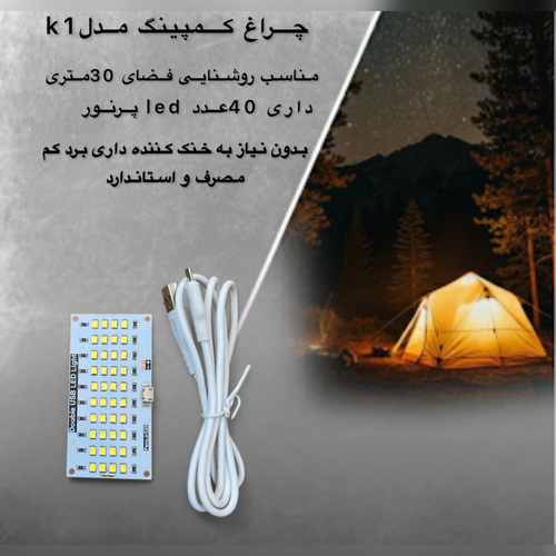 چراغ USB کمپینگ، دارای کانکتور تایپ c بوده و توسط پاور بانک تا 10 ساعت (وابسته به قدرت پاور بانک) روشنایی محیط کمپ را فراهم مینماید. مقدار روشنایی این چراغ برای فضای30 متر مربع کافیست. ولتاژ کاری محصول 5 ولت بوده و جریان مورد نیاز آن نیم آمپر است که جز لامپهای فوق کم مصرف LED قرار میگیرد. با توجه به نور بالا، بدنه محصول گرم شده و این موضوع طبیعی است. این محصول دارای 40الایدی از نوع SMD با توان 0.2 با میزان 40لومن میباشد که برق خود را توسط USB تأمین مینماید. جهت تأمین برق این محصول، پیشنهاد ما استفاده از پاور بانک و یا شارژرهای تلفن همراه است. این گجت کوچک و اقتصادی دارای بدنه ی آلومینیومی بوده و امکان نصب بر روی تمامی سطوح را دارد.